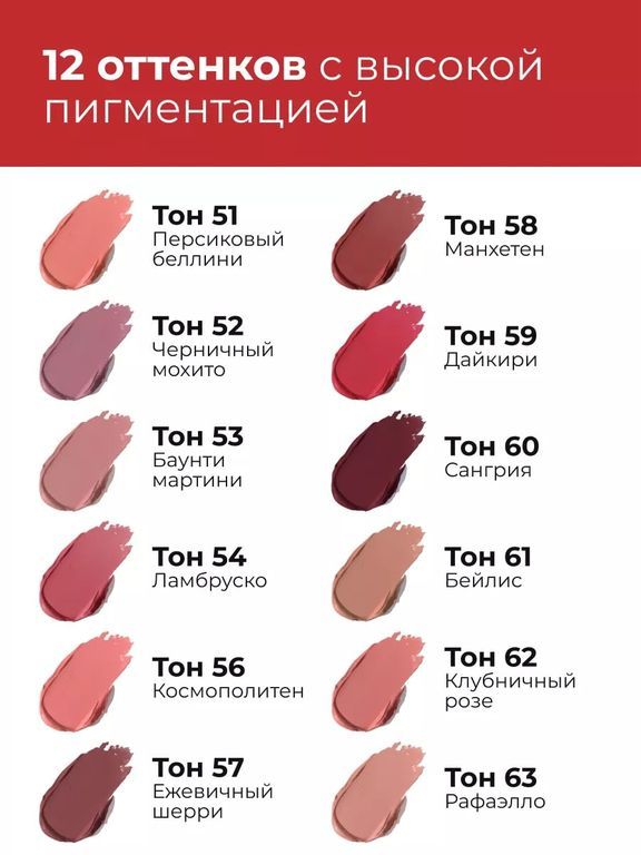 Помада покоряет насыщенным цветом с бархатным финишем, а пластичная текстура обеспечивает плотное и равномерное покрытие.