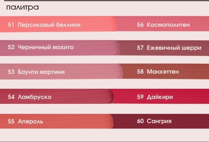 51 Персиковый беллини53 Баунти мартини54 Ламбруско56 Космополитен57 Ежевичный шерри59 Дайкири60 Сангрия61 Бейлис62 Клубничный розе