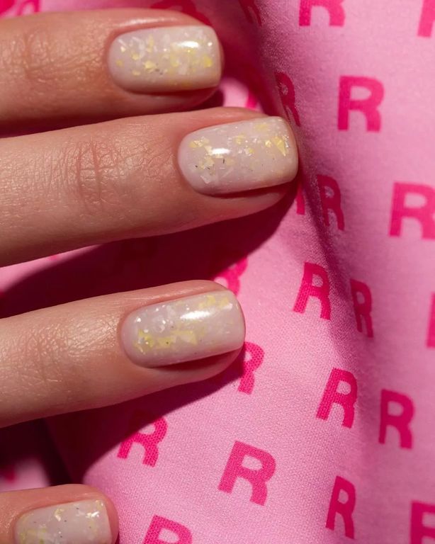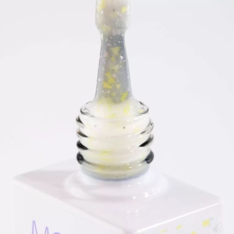 Гель-лак молочный, с жёлто-серебряной поталью, полупрозрачный