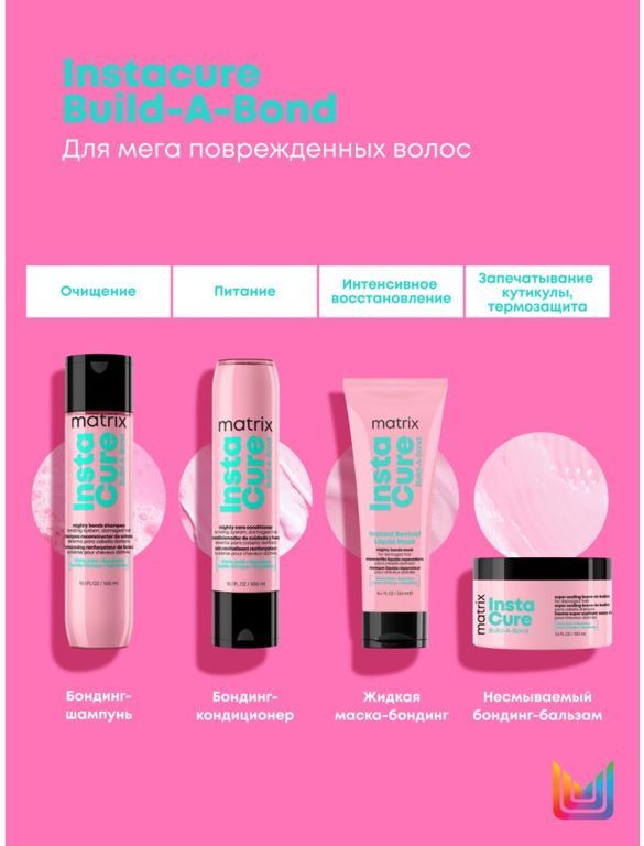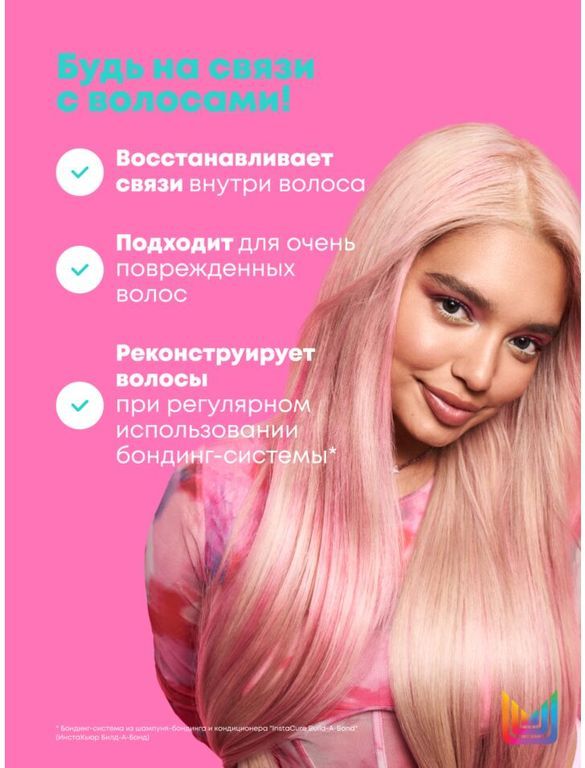 Разглаживающий бондинг-кондиционер – второй этап профессиональной системы ухода Instacure Build-A-Bond для поврежденных волос. Гамма идеально подходит для тех, кто думает, что волосы уже не спасти. 83% потребителей отмечают, что волосы словно оживают после применения гаммы.**