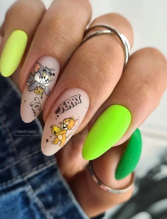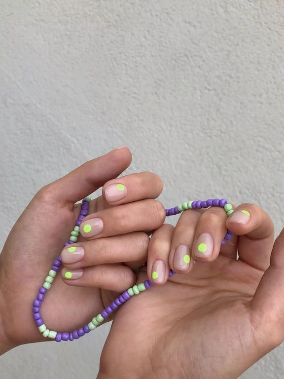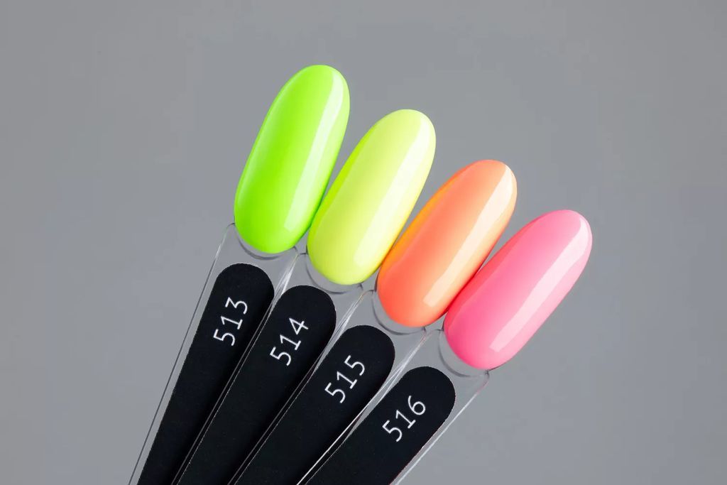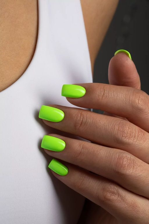 Гель-лак выбеленного неоново-салатового оттенка, без эффекта, плотный.