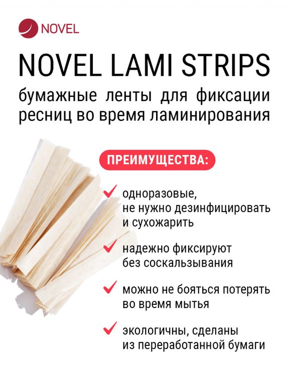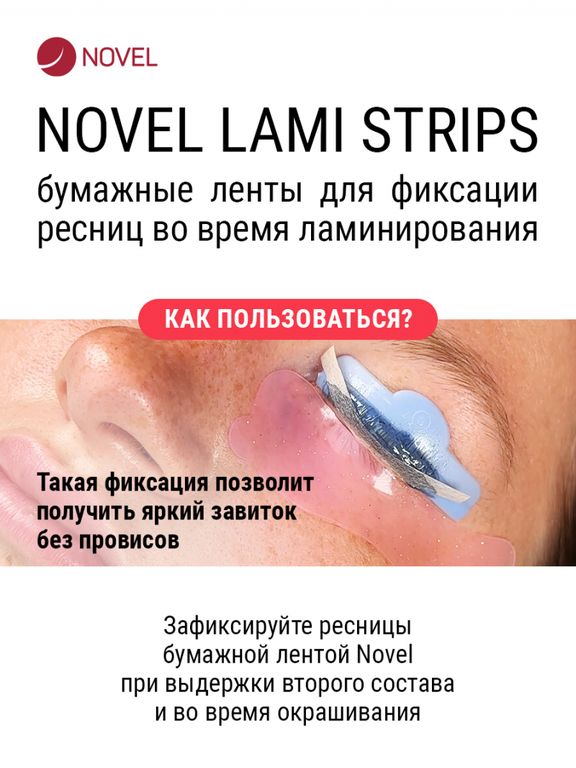В этом нам помогут бумажные одноразовые ленты Novel. С помощью этих бумажных стрипс очень хорошо прижимать ресницы к валику во время выдержки второго состава и краски.