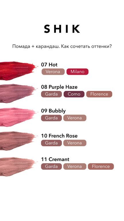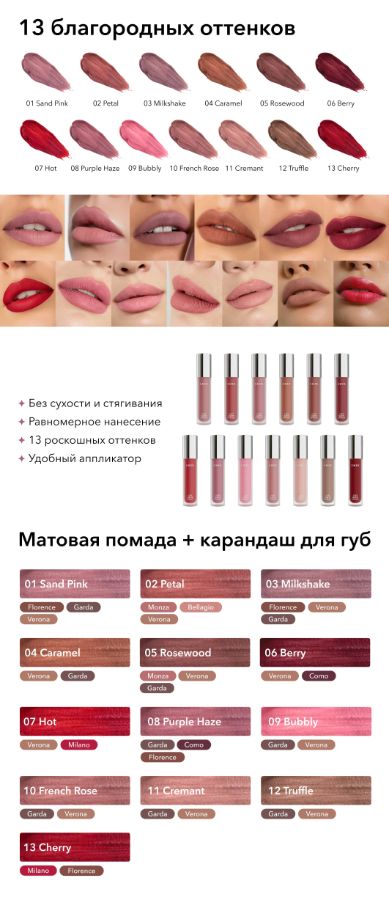 01 Sand Pink02 Petal03 Milkshake04 Caramel05 Rosewood06 Berry07 Hot08 Purple haze10 French rose11 Cremant12 Truffle