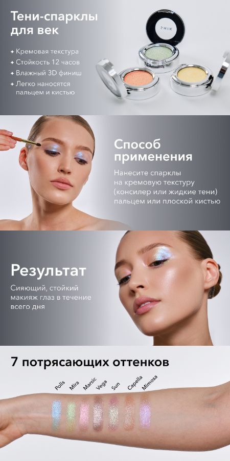 Сияющие тени для век с мерцающим «влажным» финишем для придания неотразимого 3D-сияния взгляду