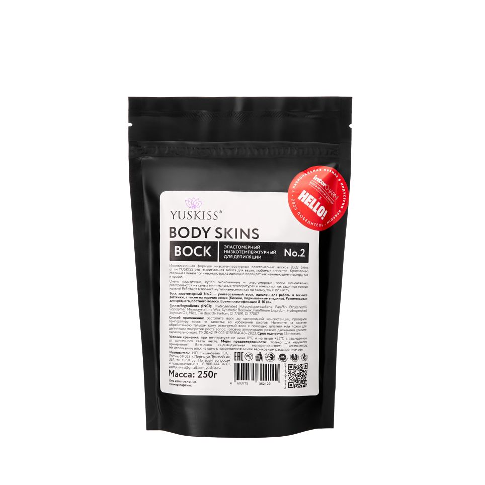 Инновационная формула низкотемпературных эластомерных восков Body Skins от тм YUSKISS это максимальная забота для ваших любимых клиентов! Кропотливо созданная линия из 4х видов полимерного воска идеально подойдет как начинающему мастеру, так и профи.