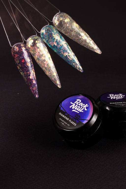 • Гель-краски без липкого слоя Diamond Flakes удобно наносить и использовать в дизайнах. Градиенты, рисунки, акценты — тебе под силу всё!