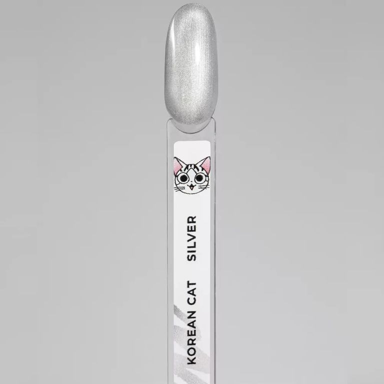 Gel-Polish Korean Cat Silver - Светло-серебряный стальной оттенок с магнитными частицами для идеального блика и шелковистого корейского эффекта. Утончённый и современный цвет, который переливается мягким блеском серебра с металлическим звучанием стали.