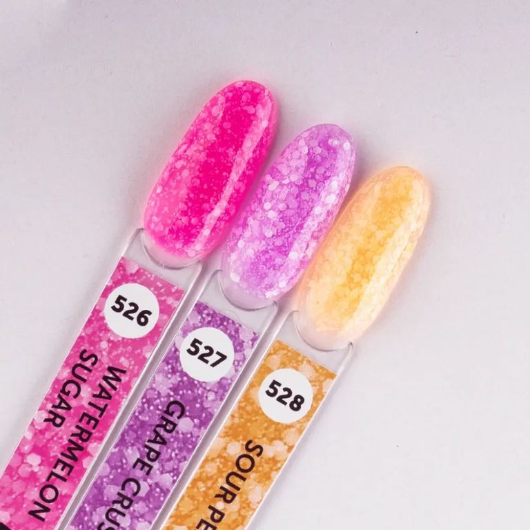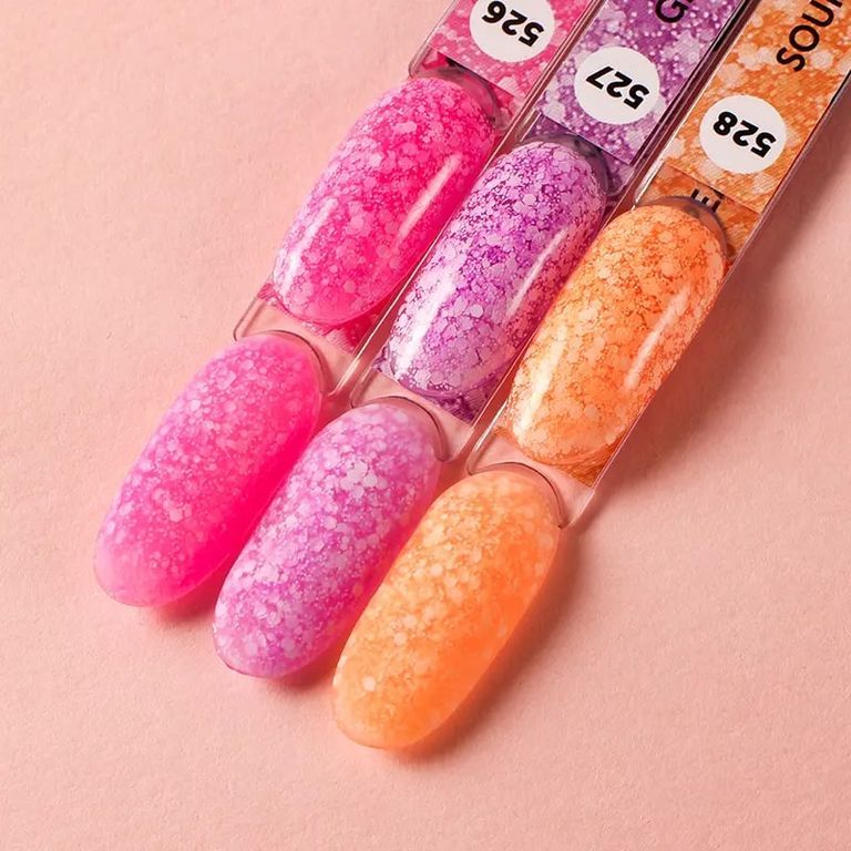 Создавай дерзкие дизайны одним движением кисти! В каждом полупрозрачном неоне из коллекции Soda утоплен матовый белый глиттер. Всего один слой — и взрывной нейл-образ готов!