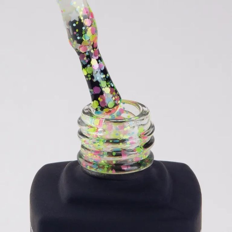 Лимонный, белый, ярко-розовый и небесно-голубой глиттер смешались в идеальной гармонии. Получился гель-лак, идеальный для воплощения твоих звездных нейл-идей!