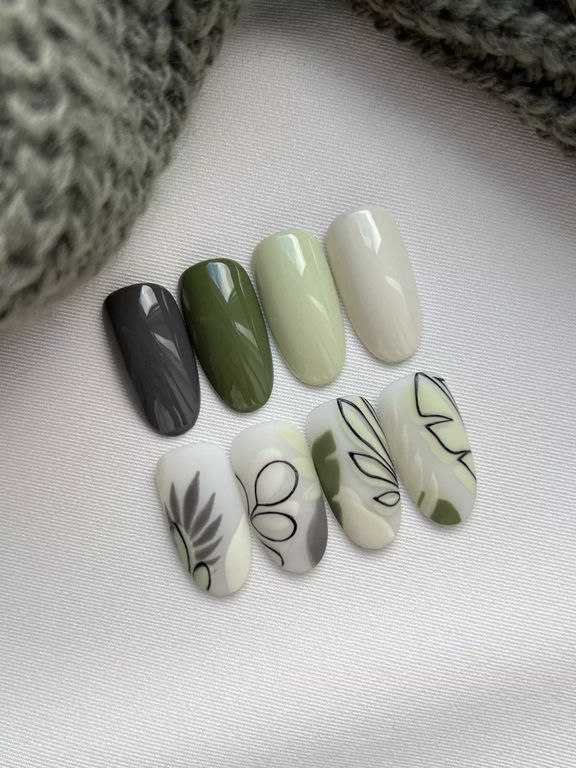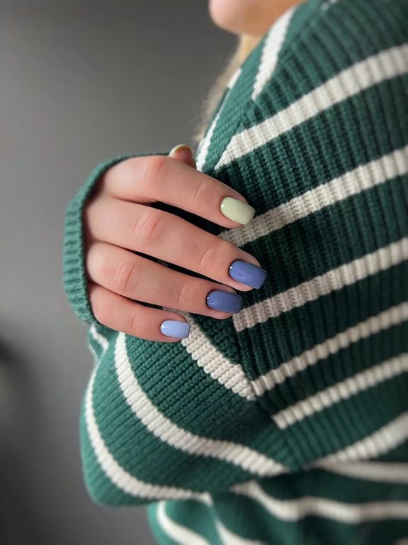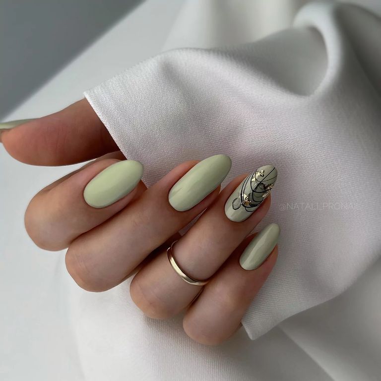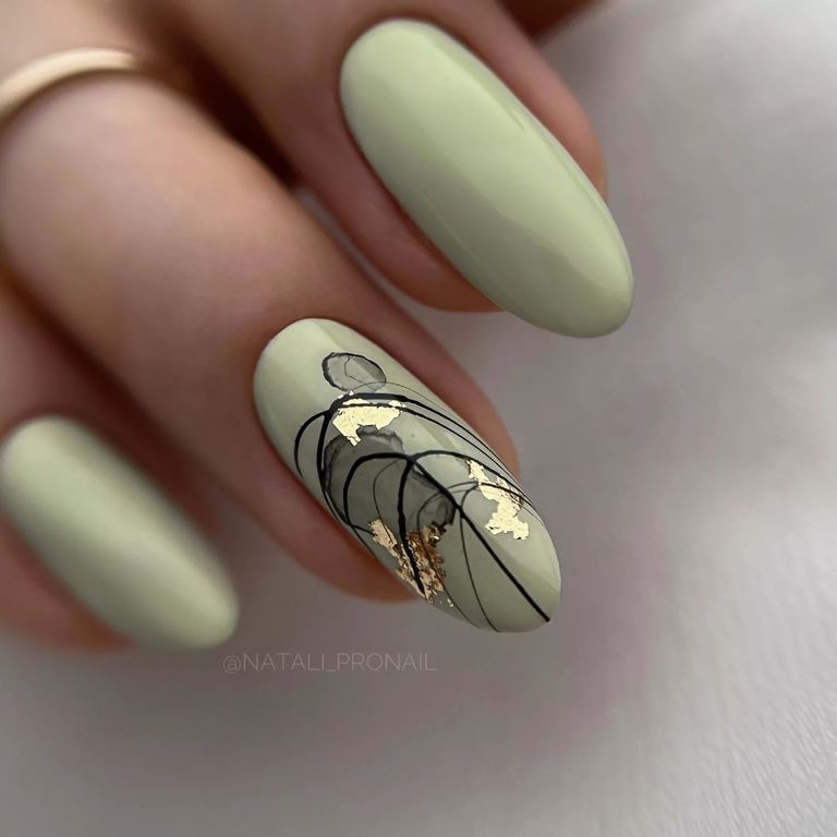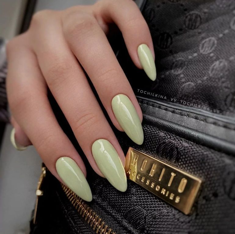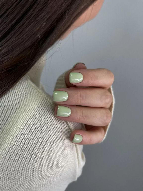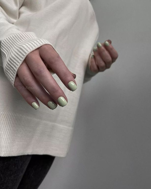 Гель-лак туманно-зеленого оттенка, без эффекта, плотный.