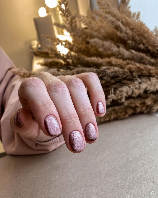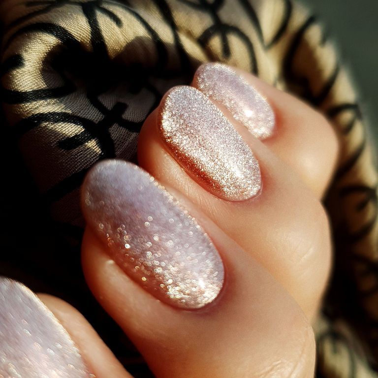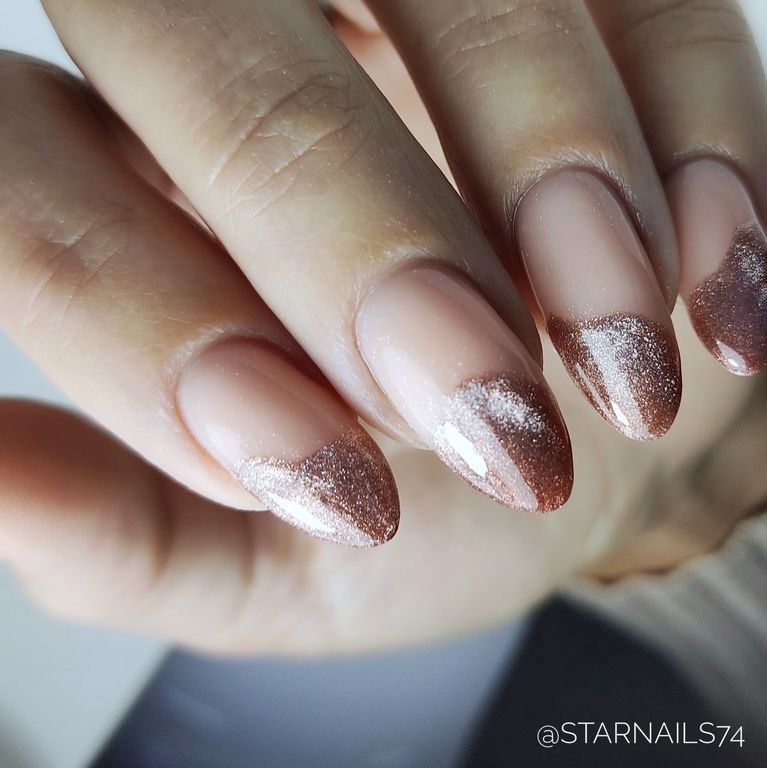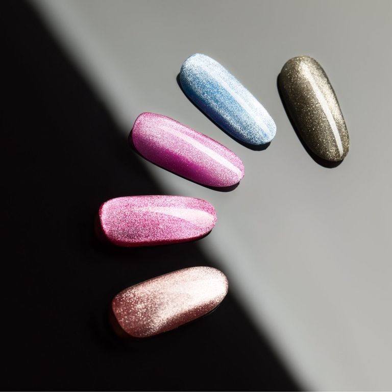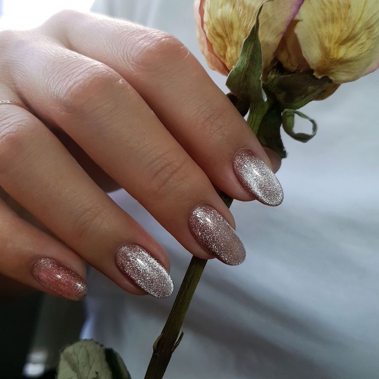 Гель-лак оттенка шампань с эффектом Кошачий глаз, плотный.