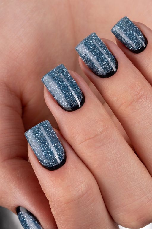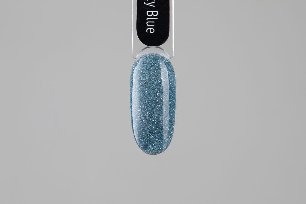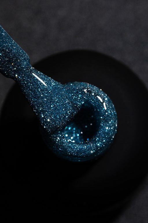 Гель-лак со светоотражающими частицами в голубом оттенке.