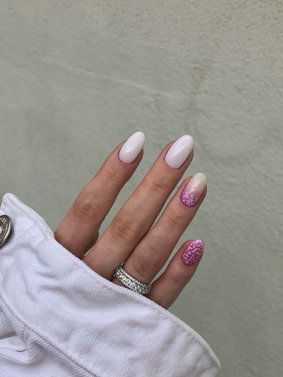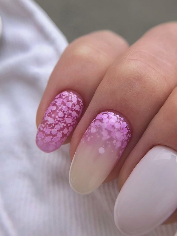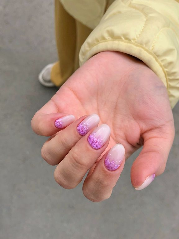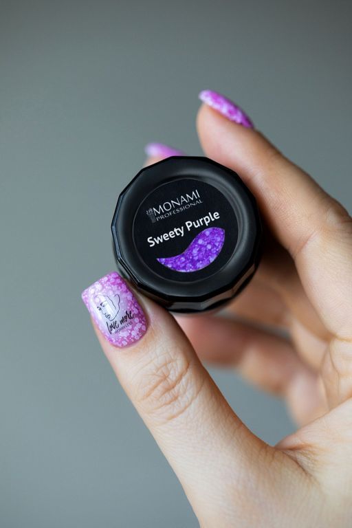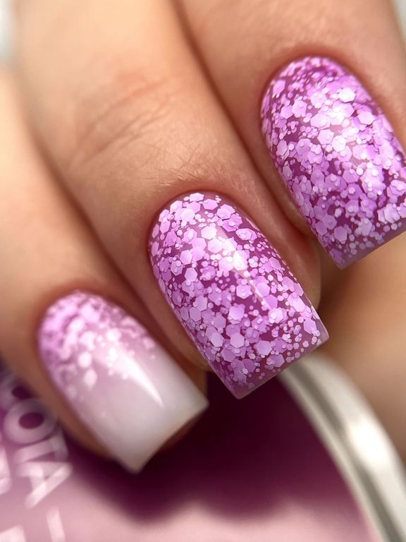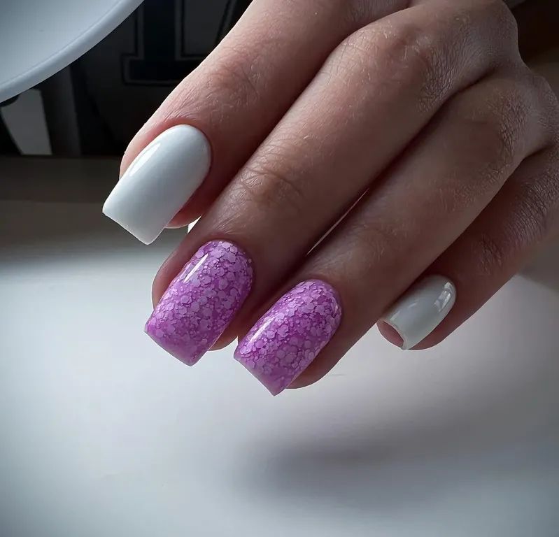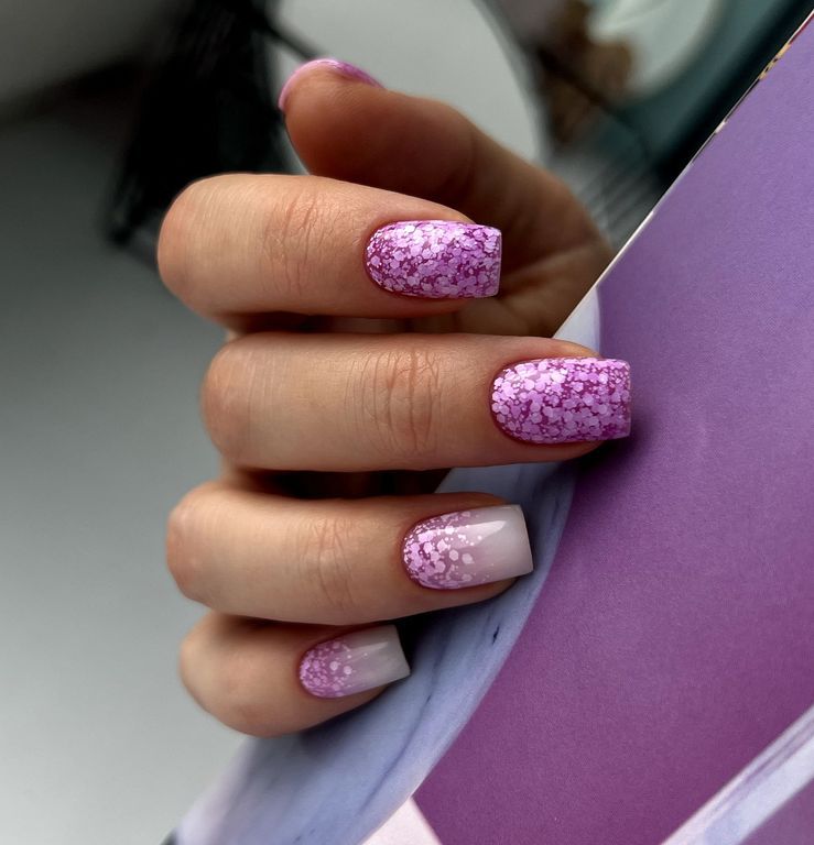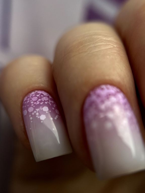 Гель-лак фиолетового оттенка c утопленными белыми шестигранниками разных размеров.