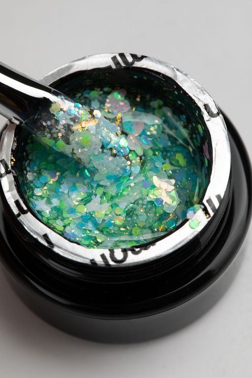 Фигурки удобно распределять для дизайна или покрывать ими ногтевую пластину полностью, выбирая нужный вид блёсток. Лёгкий витражный подтон в цвет голографических частиц понравится любителям аквариумных дизайнов.