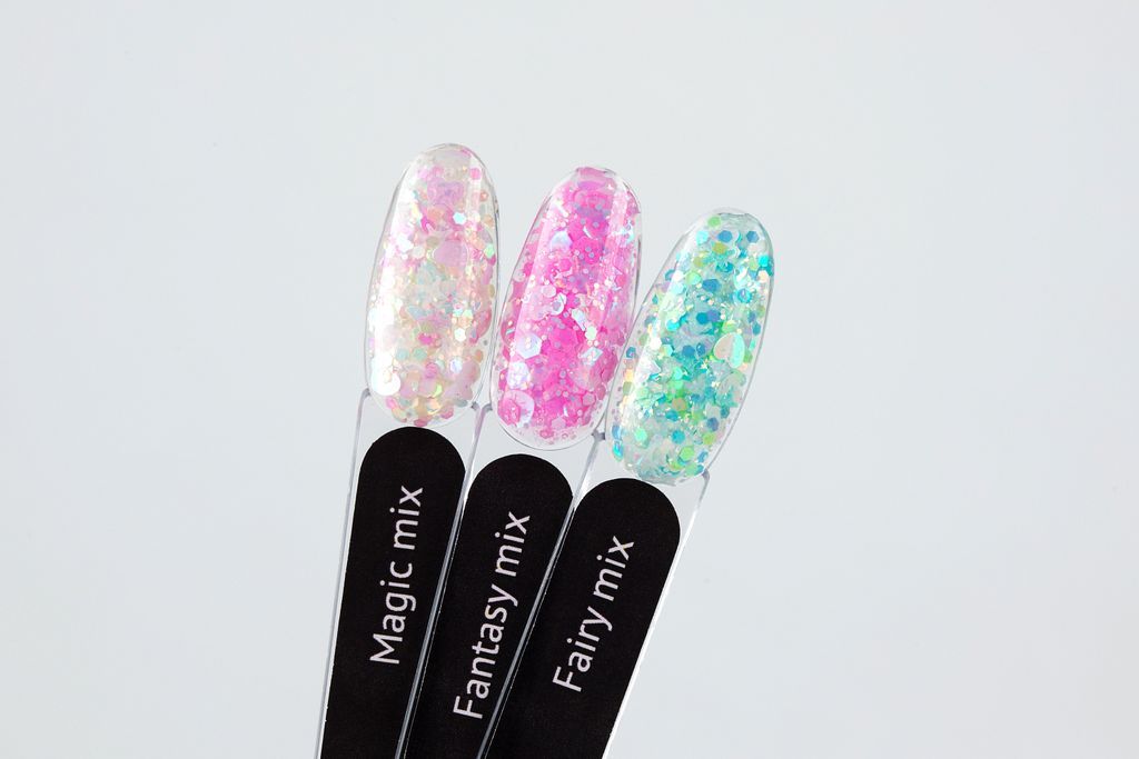 Фигурки удобно распределять для дизайна или покрывать ими ногтевую пластину полностью, выбирая нужный вид блёсток. Лёгкий витражный подтон в цвет голографических частиц понравится любителям аквариумных дизайнов.