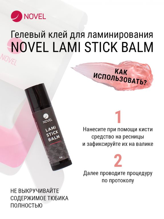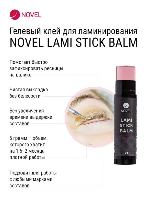 Гелевый клей для ламинирования ресниц в стике. Сокращайте время процедуры благодаря быстрой выкладке вместе с клеем Novel Lami Stick Balm. Мягкий гелевый клей практически мгновенно фиксирует ресницы на валике, время выкладки составляет от 3 до 5 минут, обеспечивает чистую выкладку без белесости. Без увеличения времени выдержки составов. Клей для ламинирования Novel Stick Balm прозрачный с приятным ароматом. Клей упакован в алюминиевый зип-пакет.
