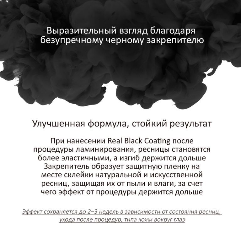 Real Black Coating - это краска закрепитель для нарощенных ресниц и закрепитель краска для ламинирования ресниц. Инновационное средство для профессионального использовния при наращивании и ламинировании ресниц, сочетает в себе функции - защитное покрытие, уход за ресницами, насыщенный черный цвет, изгиб полученный при ламинировании сохраняется на более продолжительный срок, увеличивает срок носки наращенных ресниц.