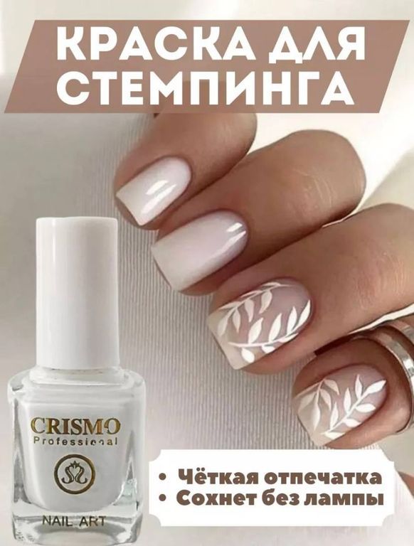 Лак для стемпинга белый. В нашем магазине представлены только оригинальные товары бренда Crismo Stamping. Это концептуальный российский бренд. Мастера маникюра и педикюра, nail индустрии и их клиенты уже успели оценить все достоинства товаров от амбициозной компании. Лаками удобно наносить рисунки на ногти или делать оригинальный френч и дизайн весна лето. Высокая пигментированность и насыщенность цвета. Густая консистенция позволяет максимально четко перенести рисунок с металлической пластины на ноготок.