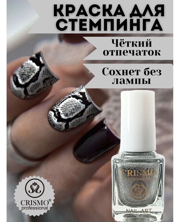 Лак для стемпинга серебро. В нашем магазине представлены только оригинальные товары бренда Crismo Stamping. Это концептуальный российский бренд. Мастера маникюра и педикюра, nail индустрии и их клиенты уже успели оценить все достоинства товаров от амбициозной компании. Лаками удобно наносить рисунки на ногти или делать оригинальный френч и дизайн весна лето. Высокая пигментированность и насыщенность цвета.