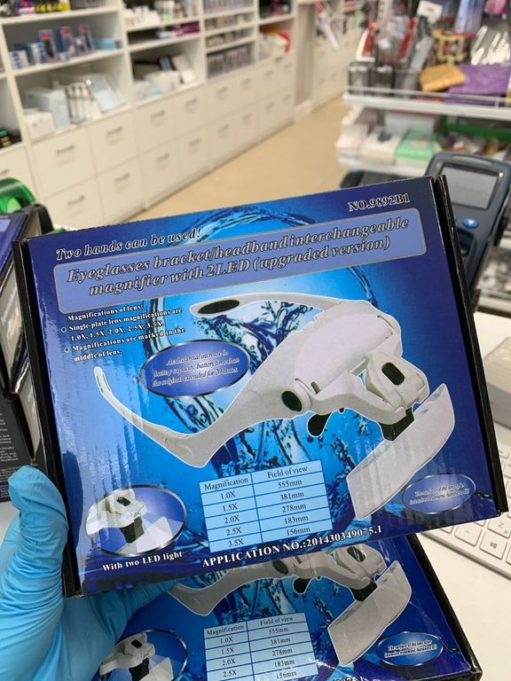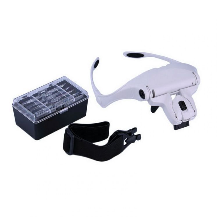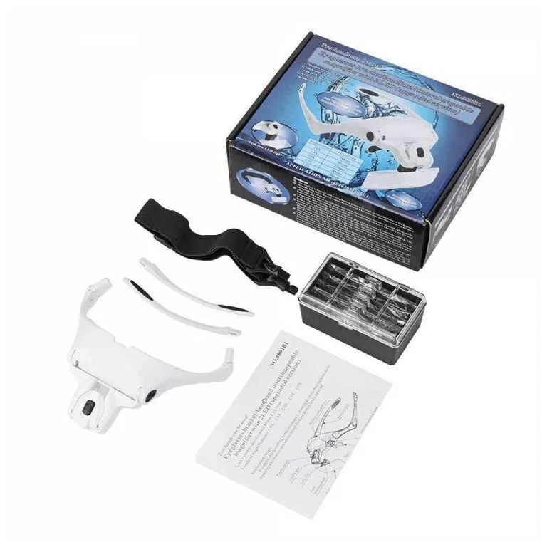 Комплектация: пластиковая оправа с подсветкой, контейнер с 5 линзами, резинка для ушей, салфетка.