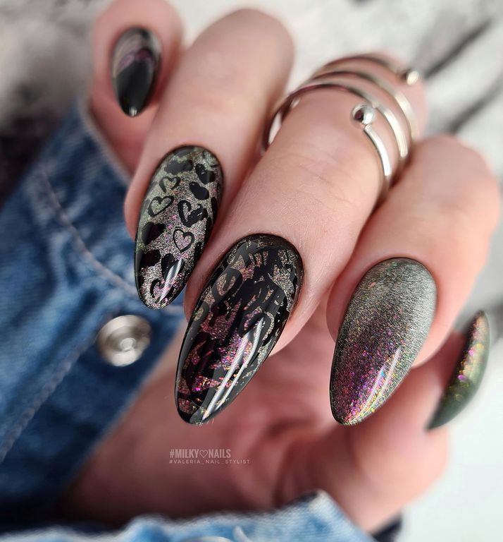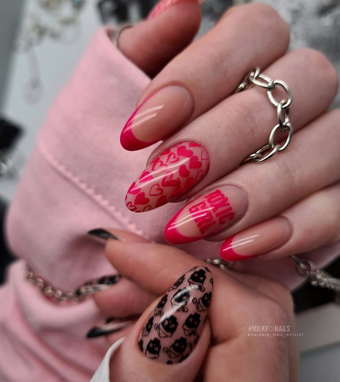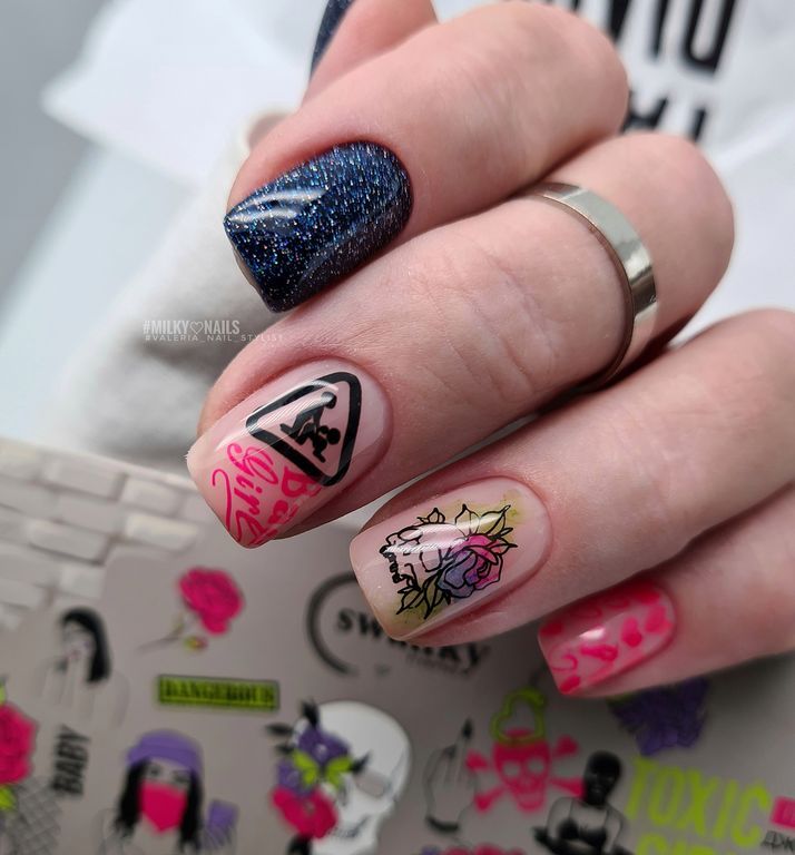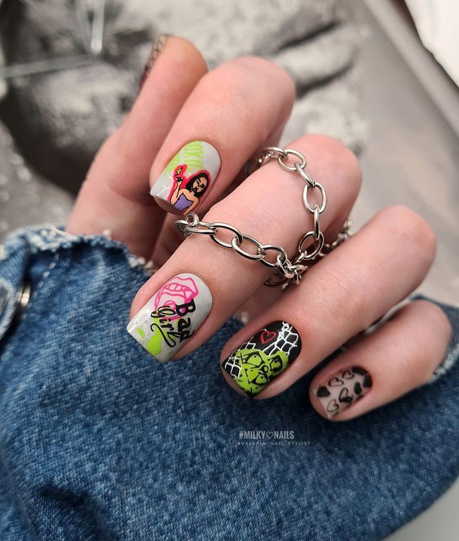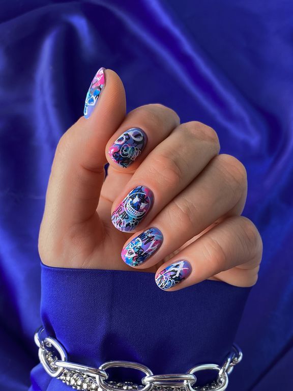 Популярный паттерн сетка, надписи изображения девушек, черепа в цветах все арты прекрасно сочетаются между собой создавая каждый раз уникальную композицию на ногтях.