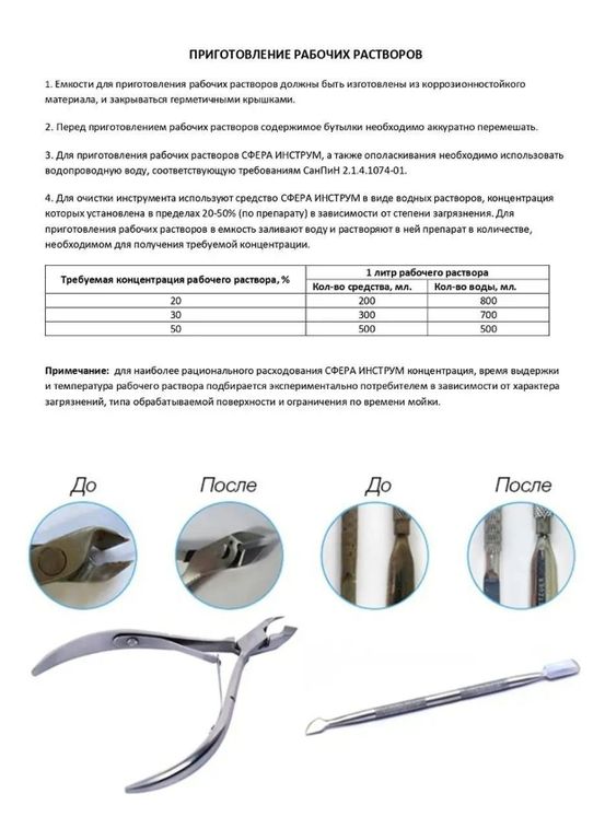 Средство предназначено для очистки маникюрного и парикмахерского инструмента после неправильной обработки от моющих и дезинфицирующих растворов. Средство очищает инструмент от коричневого налета, который образуется в результате неправильной обработки (дезинфекция и стерилизация).