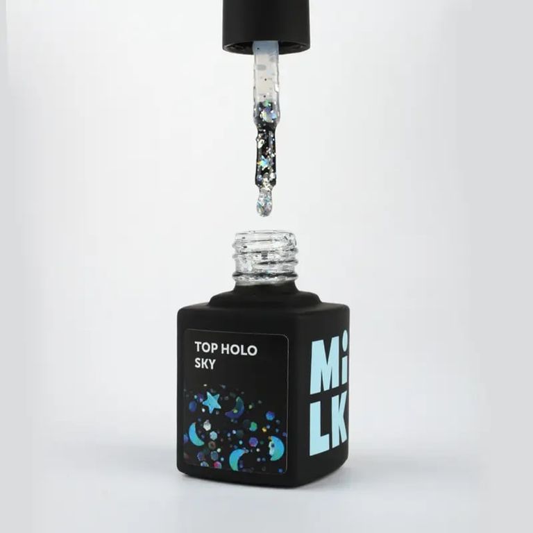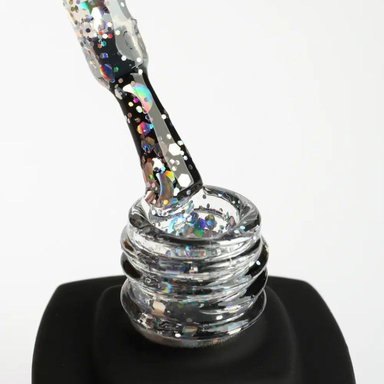 • Глянцевый топ без липкого слоя с голографическими частицами классно смотрится на светлых, темных и нюдовых оттенках и поможет тебе создавать неповторимые нейл-образы быстро и без усилий.