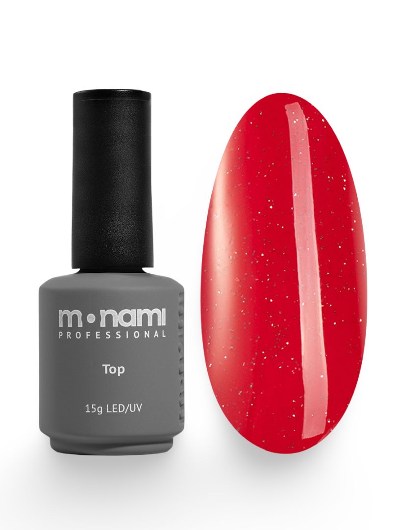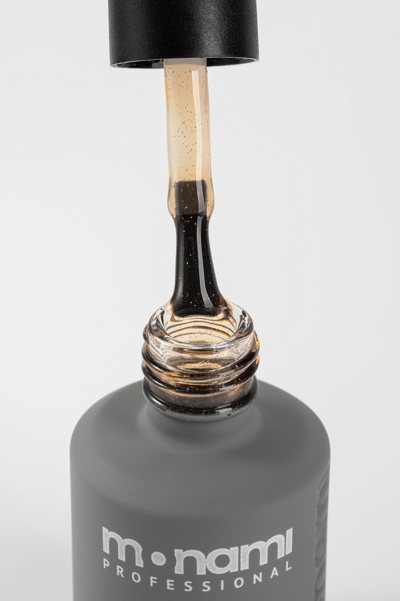 Глянцевый топ, средней жесткости, без липкого слоя, средне-густой консистенции, с полупрозрачной основой и золотыми светоотражающими частицами.